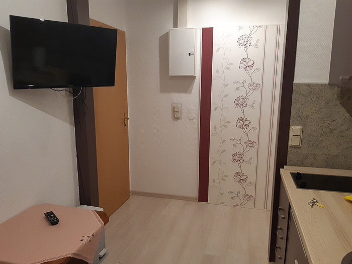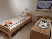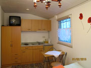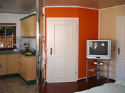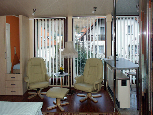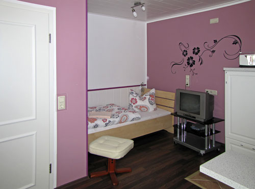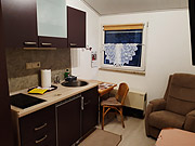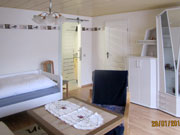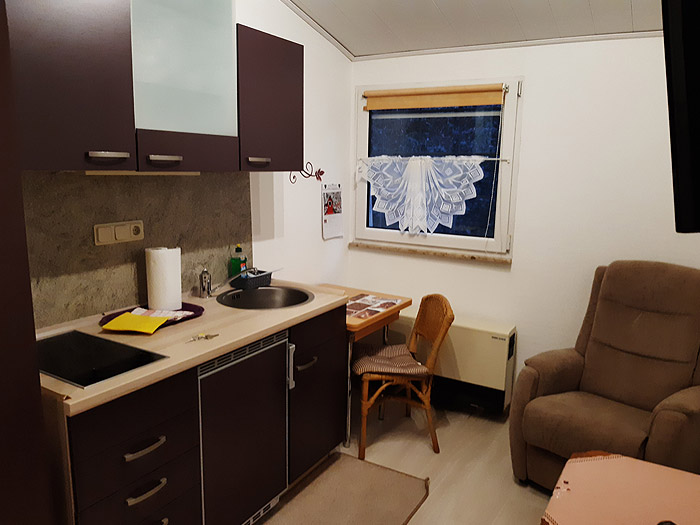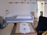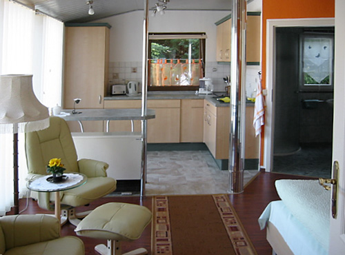 Diese Ferienwohnung bietet Platz für 2 Personen, nur getrenntes Schlafen möglich, einmal im Wohn-Schlafraum mit integrierter Küche , sowie einmal in einem separaten Schlafzimmer. (Bestens geeignet für Schnarcher). Ausstattung: Du/WC, TV, komplette Küche mit Herd, separatem Ceranfeld 4 Platten, Kühlschrank, Geschirr, Sitzecke mit Fernsehsesseln.